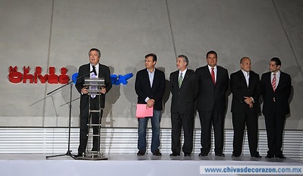 Previo al corte del listón con el que el Museo Interactivo Chivas Comex, en el que estuvieron presentes Jorge Vergara, Presidente del Consejo de Administración del Grupo Omnilife-Chivas, Marcos Achar, Presidente de Grupo Comex, Emilio González Márquez, gobernador del estado de Jalisco, quienes dirigieron unas palabras a los asistentes a este gran evento.