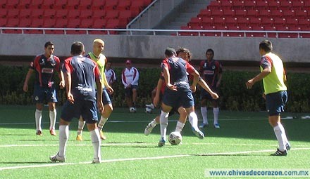 La práctica en el Estadio Omnilife dio inicio en punto de las 9:30 horas con una breve entrada en calor, que consistió en diversos ejercicios de frecuencia a lo largo de la cancha y estiramientos bajo la supervisión del Preparador Físico, Armando Camacho.