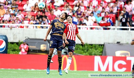 Chivas presionó la cabaña universitaria, y tuvo una llegada de peligro cuando en un despeje de Luis Michel, Jesús Sánchez le bajó de cabeza la pelota a Omar Arellano quien le dio el tiempo y le regresó un pase filtrado que el delantero rojiblanco conectó de pierna izquierda y Alejandro Palacios contuvo el disparo.