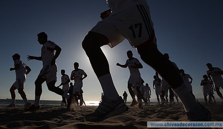 Minutos después de las seis de la tarde, Tiempo del Pacífico, el conjunto tapatío apareció en la playa para dar comienzo a su tercera práctica de este día con una serie de ejercicios de frecuencia y potencia en la arena para hacer la entrada en calor con miras a un exigente trabajo aeróbico.