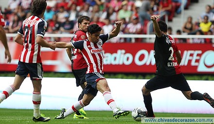 Chivas le puso intensidad a las acciones y tuvo otro par de opciones de gol, primero a los 37’ en un potente disparo de Marco Fabián en el cual la pelota pasó muy cerca del arco rojinegro y después a los 40’ en una jugada en la que Aldo de Nigris, con la marca de Leandro Cufré, hizo un remate de media vuelta que exigió la estirada de Miguel Pinto para evitar que el esférico entrara a primer poste.