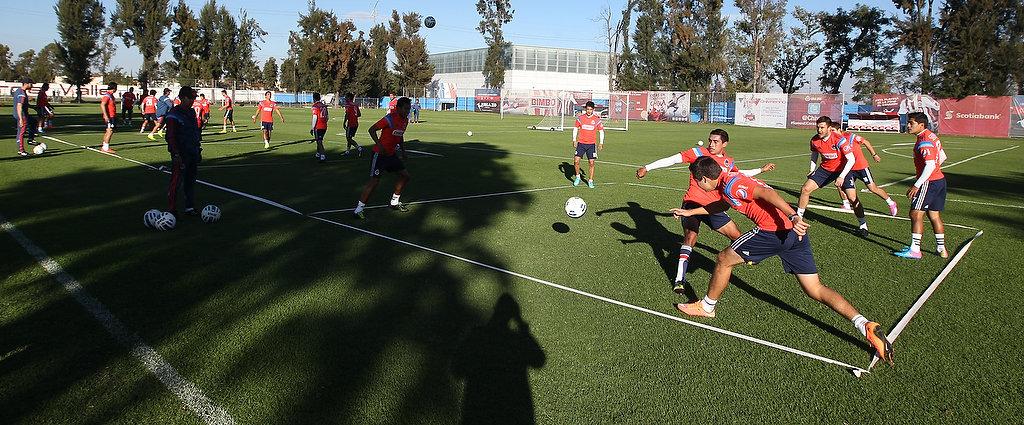 Ejercicio de posesión de balón en espacio medio en dos equipos con tres comodines, en el cual los integrantes del Cuerpo Técnico hicieron énfasis en la presión al rival cuando no se tiene la pelota.