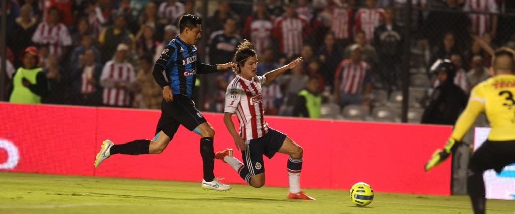 Querétaro, Querétaro.- Haber dominado durante la primera mitad del partido con base en un juego dinámico y de buen trato a la pelota no fue suficiente para que Guadalajara continuara con su racha triunfal en el Torneo de Clausura 2015, al caer por 1-0 en su visita a los Gallos Blancos del Querétaro, en la Jornada Nueve de la Liga Bancomer MX.